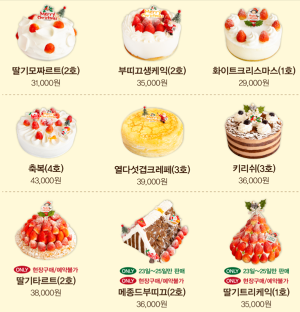 대전 외 지역에서 오시는 분들을 위해 예약 가능 케이크도 준비되었습니다. 예약은 12월 15일까지 결제 완료된 건에 한해 가능합니다. 예약이 불가하고 현장 구매만 가능한 케이크도 있으니 살펴보세요!