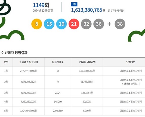 - 1등 당첨자: 17명 (1인당 약 16억 1338만 원)